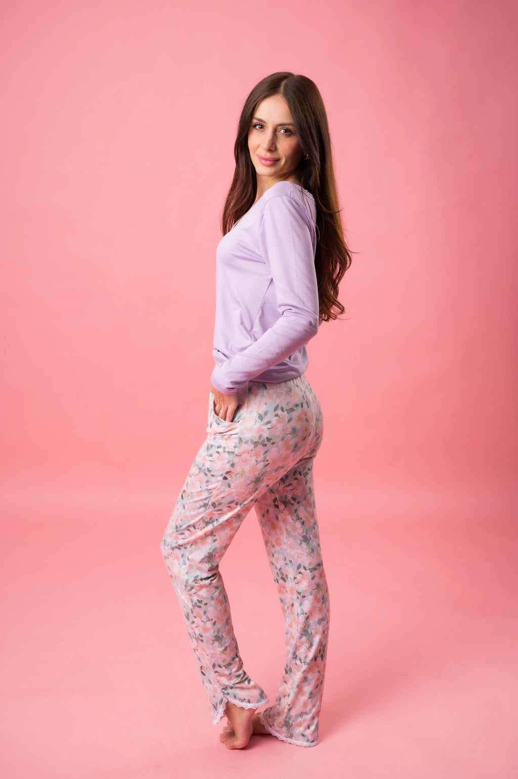 El pantalon es recto, estampado, con bolsillos delanteros, botamanga circular con detalle de puntilla de 1,5 cm al tono, cintura elastizada de 3 cm de ancho.